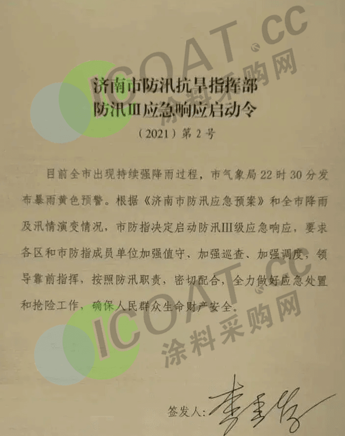 7月12日凌晨0點,濟南市防指副指揮、濟南市城鄉水務局局長李季孝簽署濟南市防汛抗旱指揮部防汛Ⅲ級應急響應啟動令(2021)第2號。