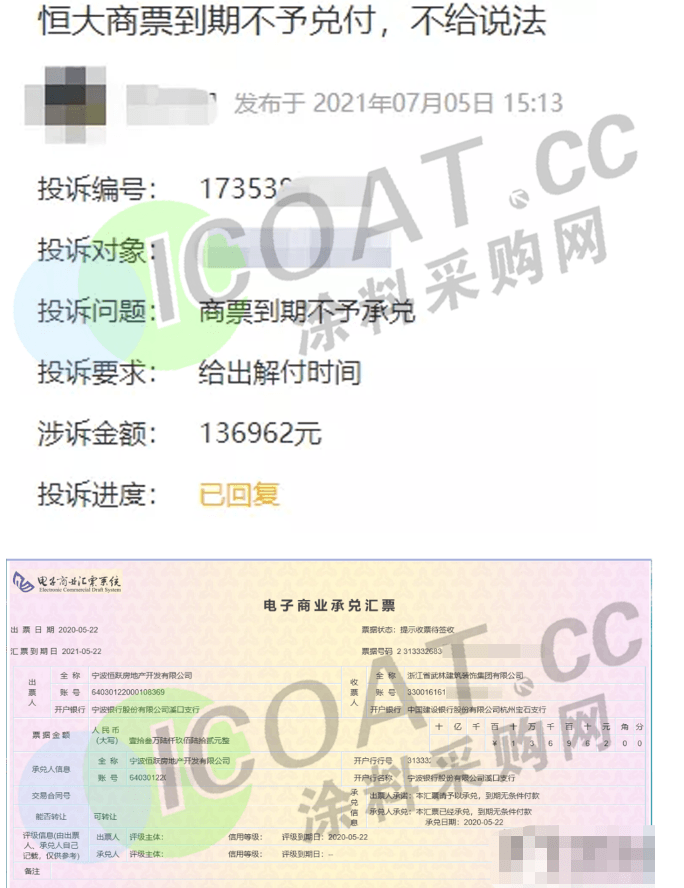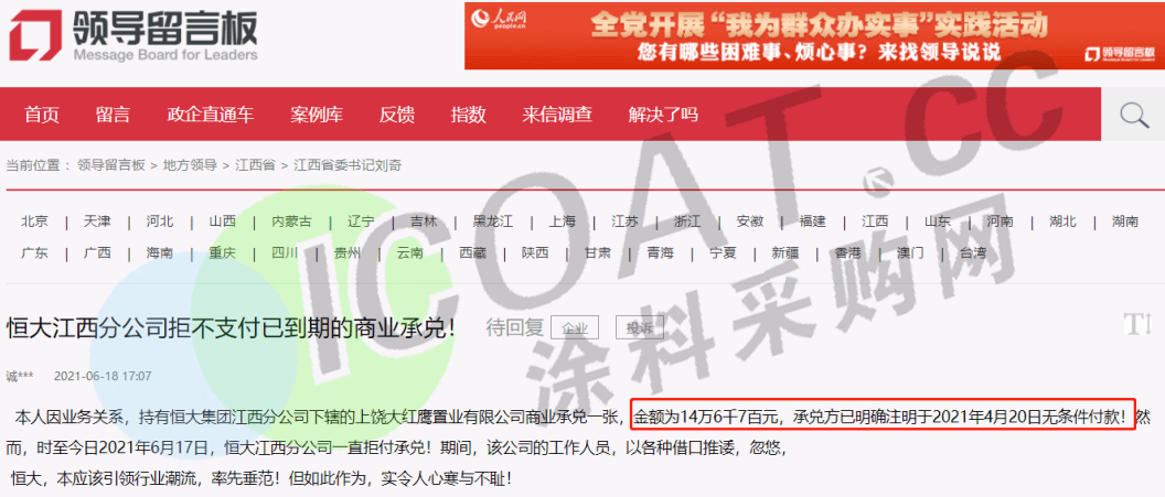 近期在人民網領導留言板網頁,多人留言稱恒大及其下屬公司承兌匯票逾期未兌付,并表示企業生產發展帶來了很大的影響,甚至導致企業沒有資金發工資,只得停工停產,懇請加強對恒大集團開具商業承兌匯票到期拒付的監管。據不完全統計,承兌匯票逾期未兌付金額從幾萬到幾百萬不等,供給近千萬元商票目前逾期未兌付。