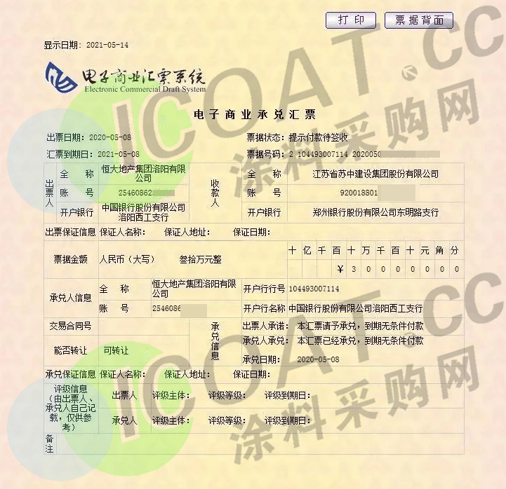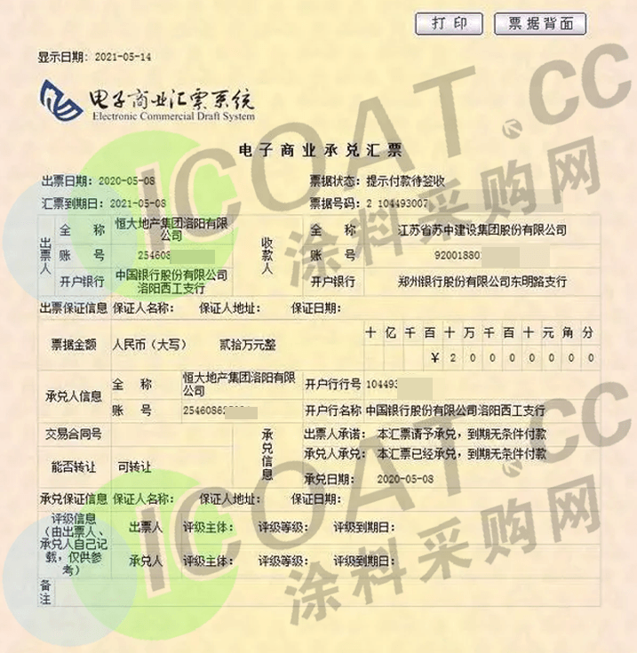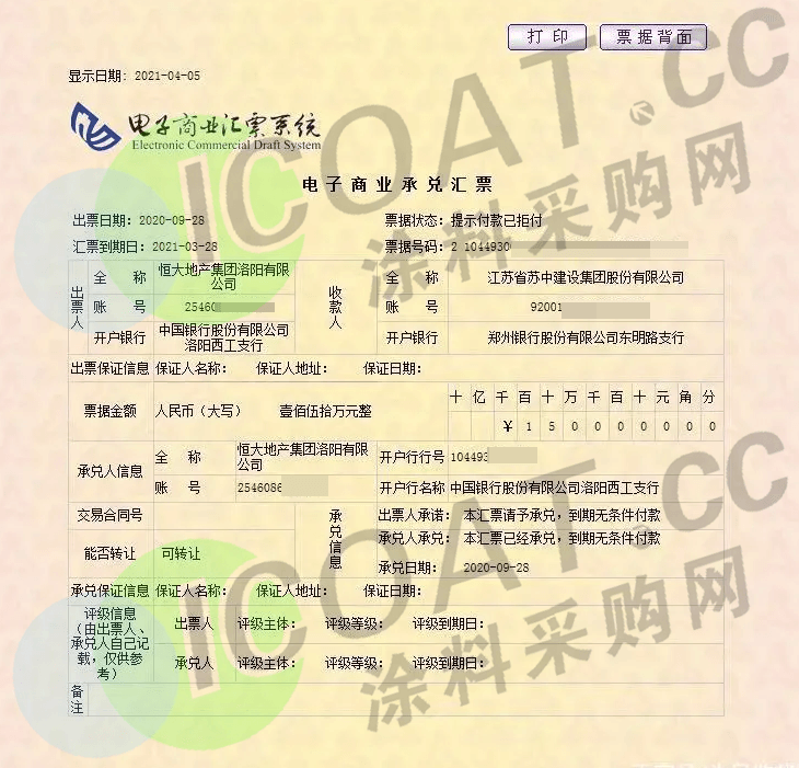 公開資料顯示,截止2020年12月31日,恒大商業承兌匯票余額高達2052.67億,較2019年增長了25.69%,且恒大的商票在二級市場上流通性很大,據網傳恒大系企業開立的商票價格已經加到了27個點。涂料行業做為房產項目必不可少的原料之一,與房產企業有著密切的合作關系,貨款的支付也離不開承兌匯票這種方式,據涂料采購網不完全統計,華潤漆、佐敦、凱倫股份等眾多知名涂料企業均為恒大集團的供應商,且涂料行業應收票據超過50億元,巨額的票據數據離不開房企的“貢獻”。