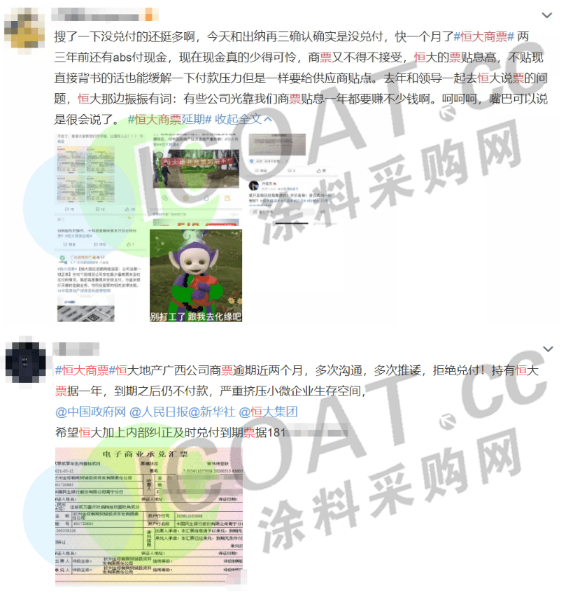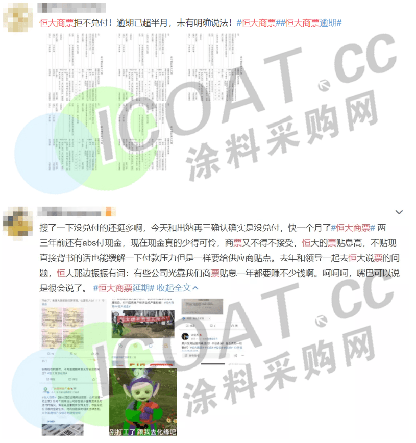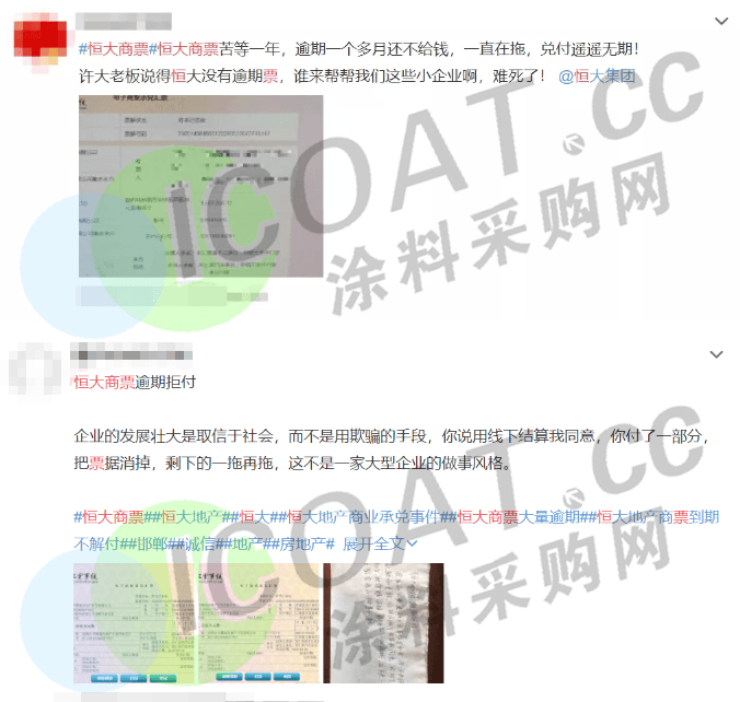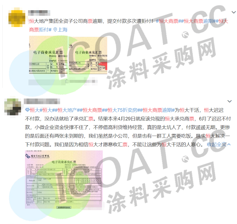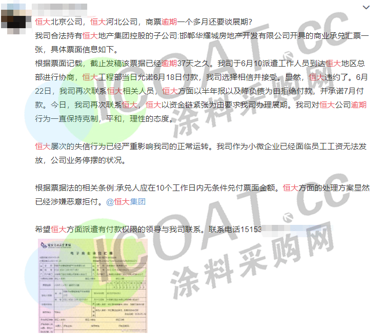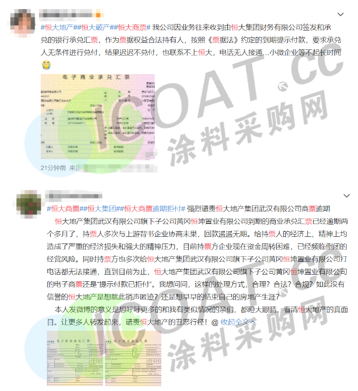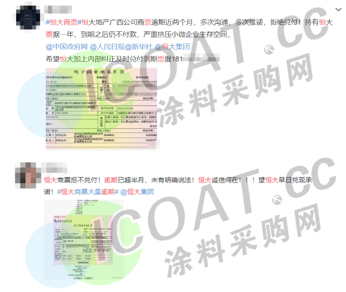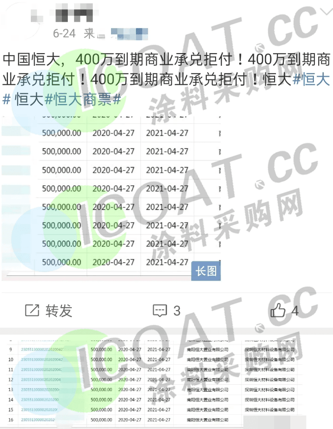 微博某網友表示,恒大400萬到期商業承兌拒付。