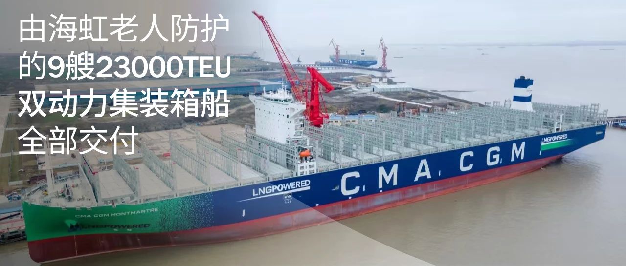 該船型是全球最大的雙動(dòng)力集裝箱船,不僅是中國首制,更是全球首制。其中5艘于滬東中華造船(集團(tuán))有限公司長興島造船基地建造,另外4艘于江南造船(集團(tuán))有限責(zé)任公司建造。目前,由海虹老人提供防護(hù)的9艘雙動(dòng)力超大型集裝箱船已全部完成交付。