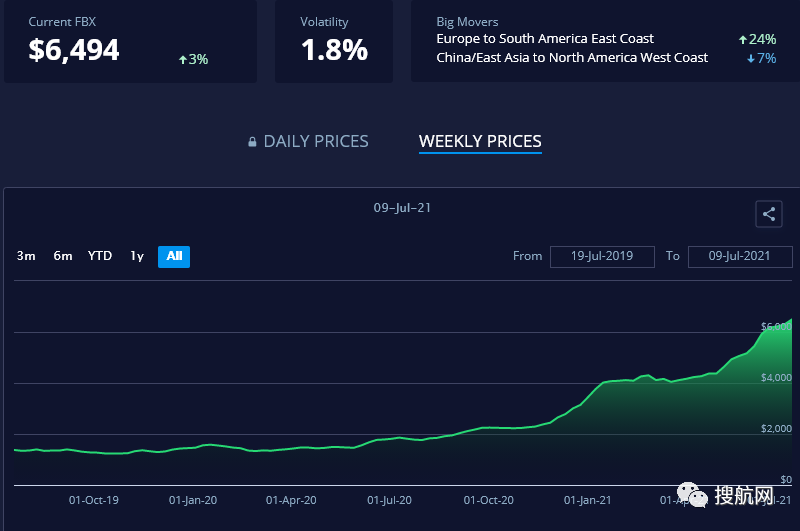 而最新一期的波羅的海貨運指數(Freightos Baltic Index--FBX)顯示,亞洲-北歐即期價格12,203美元/FEU,上漲7.4%,比去年同期高出600%。對于地中海港口,FBX上周上漲2.9%,至11,684美元/FEU,比一年前上漲了511%。