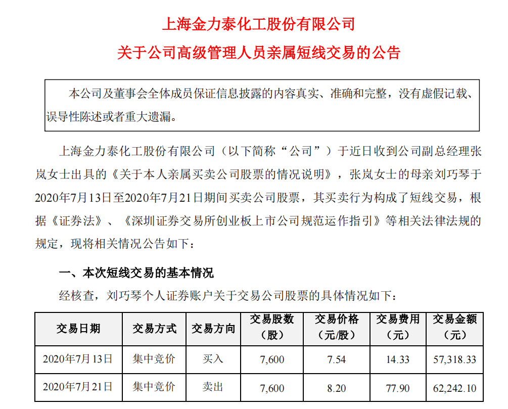 而在今年1月25日,金力泰曾發(fā)布公告,披露了公司高管人員及其親屬進(jìn)行短線交易事項(xiàng)。公告稱,2020年7月,公司副總經(jīng)理張嵐母親劉巧琴分兩次買入金力泰股票,交易金額達(dá)到119560.43元(第一次57318.33元,第二次62242.10元),并從中獲利,所得收益4923.77元。所得收益作為此次短線交易的獲利金額已全額上繳公司。
