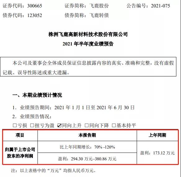 近日,飛鹿股份(或稱“公司”)發(fā)布業(yè)績預告,預計2021年上半年歸屬于上市公司股東的凈利潤294.30萬元~380.86萬元,同比增長70%~120%。
