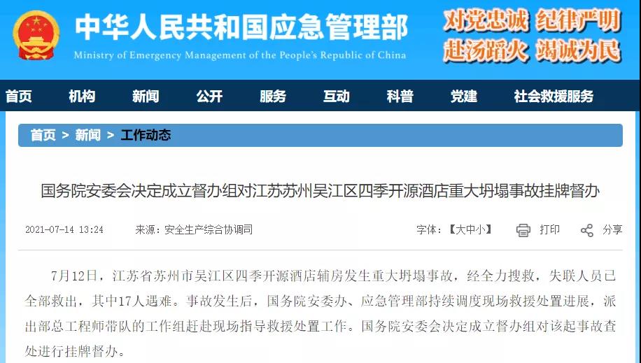 7月12日15時許,蘇州市吳江區松陵街道油車路188號四季開源酒店輔房發生坍塌。截至14日9時,搜救工作全部結束,失聯人員已全部救出,共搜尋出被困人員23人,其中17人遇難。14日,記者從應急管理部官方微博了解到,國務院安委會決定成立督辦組對該起事故查處進行掛牌督辦。