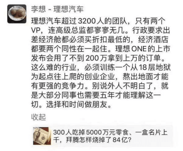 理想汽車CEO李想曾在朋友圈轉發一篇名為《300人吃掉5000萬零食、一盒名片上千,拜騰怎樣燒掉了84億?》的文章,將其推上風口浪尖。李想評論稱:理想汽車超過3200人的團隊,只有兩個VP(副總監),連高級總監都寥寥無幾。行政要求出差經濟艙都必須買折扣最低的,經濟酒店都要兩個同性在一起住,暗諷拜騰汽車的豪奢做派。