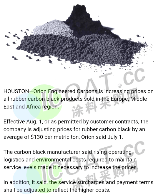 德國歐勵隆ORION(原贏創德固賽):從8月1日起公司橡膠炭黑的價格上調130美元/噸(約合人民幣841元/噸)。
