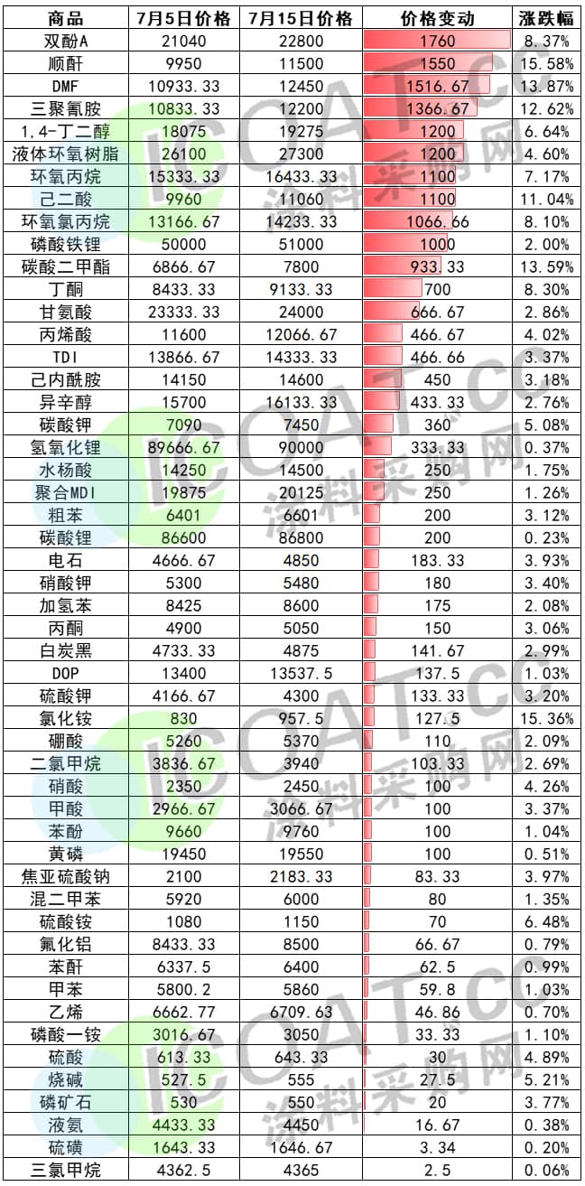 而在化工龍頭企業的帶領下,國內化工品市場再現火爆之勢,丁二烯日漲1600元/噸,丙二醇日漲1133元/噸,碳酸二甲酯日漲1134元/噸,近百種化工原料火速跟漲,一周的時間上漲超過1000元/噸,氣氛火爆異常。