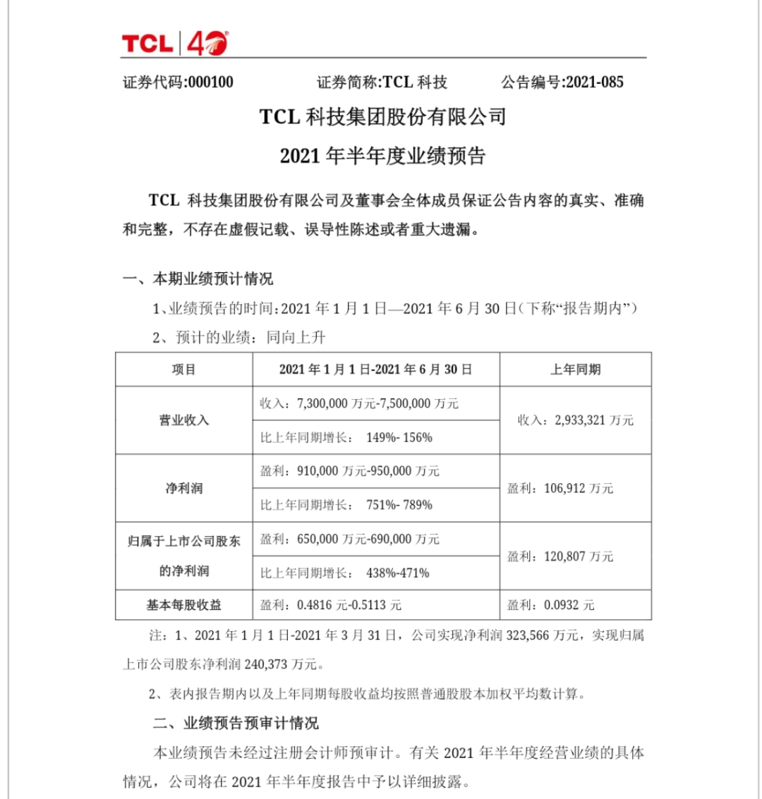 TCL科技7月14日晚發布2021年半年度業績預告,公司預計上半年度實現營業收入730億-750億元,同比增長149%-156%;凈利潤91億元-95億元,同比增長751%-789%;歸屬于上市公司股東的凈利潤65億元-69億元,同比增長438%-471%。