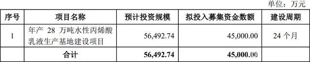 保立佳首次公開發行股票實際募集資金扣除發行費用后,將用于年產28萬噸水性丙烯酸乳液生產基地建設項目,預計擬投入募集資金4.5億元。