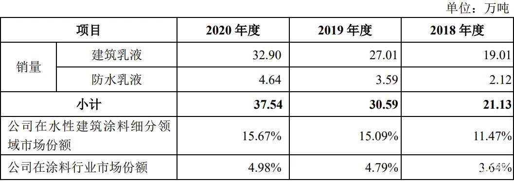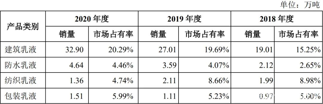 招股書顯示,2020年公司產能為37.68萬噸,銷量為41.02萬噸,在行業內位居前列2019年產能為38.71萬噸產品銷量為34.35萬噸其中水性丙烯酸乳液銷量為33.82萬噸2019年保立佳所占市場份額為11.11%。
