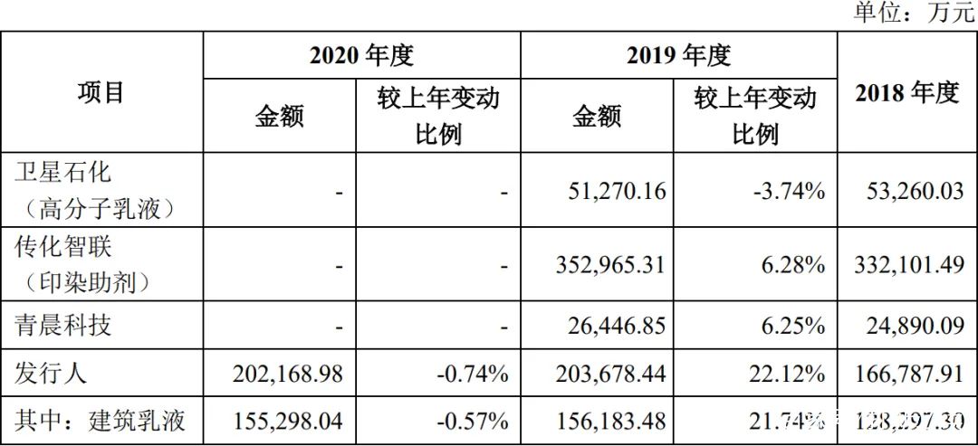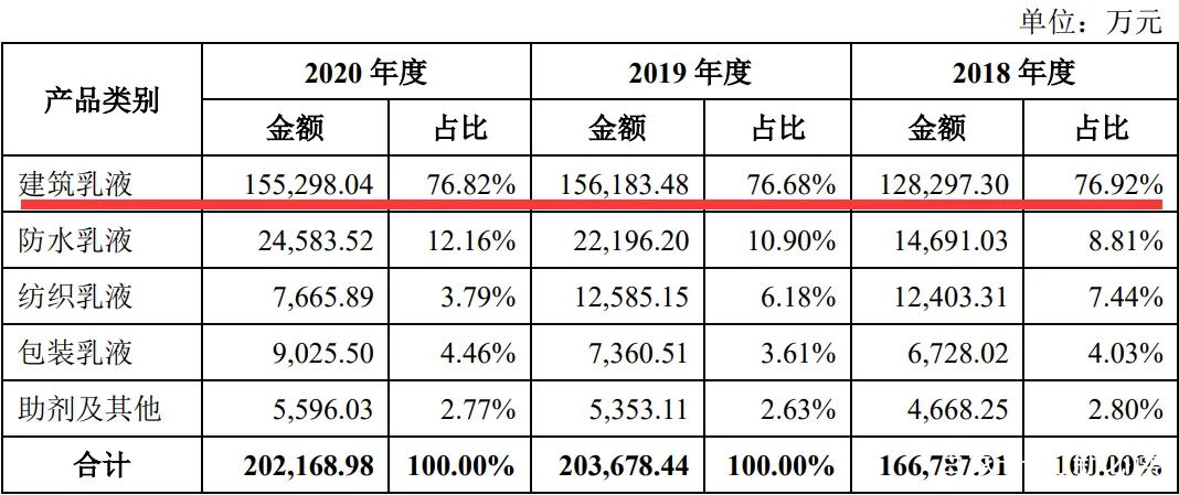 報告期內,公司建筑乳液產品收入分別為12.83億元,15.62億元,和15.53億元,占主營業務收入的比例分別為76.92%,76.68%和76.82%,是公司主營業務收入的主要來源公司。防水乳液產品收入分別為1.469億元,2.220億元和2.458億元,占主營業務收入的比例分別為8.81%,10.90%和12.16%,占比保持穩定。