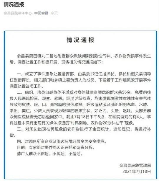 19日上午,江西贛州會(huì)昌縣應(yīng)急管理局發(fā)布通報(bào)稱,截至7月18日下午5點(diǎn),有乏力、頭暈、嘔吐等輕微的臨床癥狀的4人在醫(yī)院留觀。事件應(yīng)急處置指揮部已對(duì)出現(xiàn)枯黃現(xiàn)象的農(nóng)作物進(jìn)行了全面統(tǒng)計(jì)、造冊(cè)登記,將進(jìn)行補(bǔ)償。