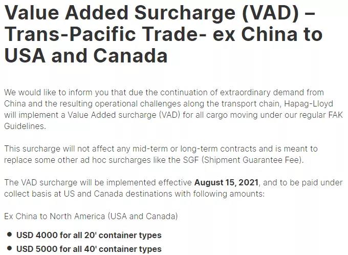 此附加費不會影響任何中期或長期合同,旨在取代其他一些臨時附加費,如SGF(發貨保證費)。VAD附加費將于2021年8月15日生效,并在美國和加拿大目的地按托收方式支付,金額如下: