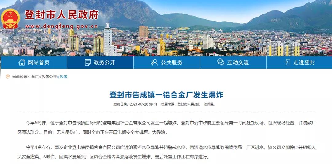 當日早4點左右,事發企業登電集團鋁合金有限公司臨近的潁河水位暴漲并超警戒水位,因河道水位暴漲致圍墻倒塌,廠區進水,該公司立即停電并組織人員安全撤離。6時許,因洪水漫延到廠區內合金槽內高溫溶液發爆炸。