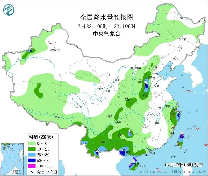 另據中央氣象臺發布暴雨黃色預警:預計22日8時至23日8時,河北西南部、河南西北部、廣西南部、廣東雷州半島、海南島西北部、云南南部、浙江中北部沿海、臺灣島中北部等地的部分地區有大到暴雨。