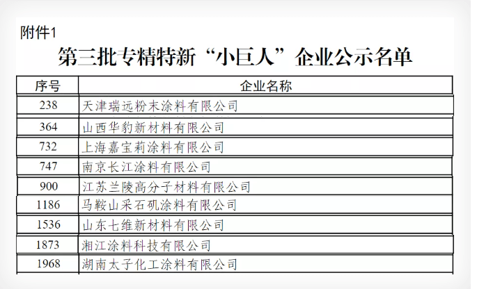 據(jù)涂料采購網(wǎng)不完全統(tǒng)計(jì),天津瑞遠(yuǎn)粉末涂料有限公司、山西華豹新材料有限公司、上海嘉寶莉涂料有限公司、南京長(zhǎng)江涂料有限公司、江蘇蘭陵高分子材料有限公司、馬鞍山采石磯涂料有限公司、山東七維新材料有限公司、湘江涂料科技有限公司、湖南太子化工涂料有限公司等多家涂料企業(yè)入圍第三批專精特新“小巨人”企業(yè)。