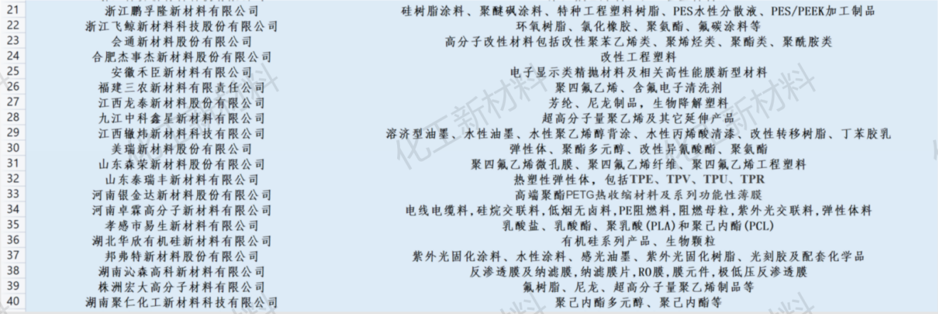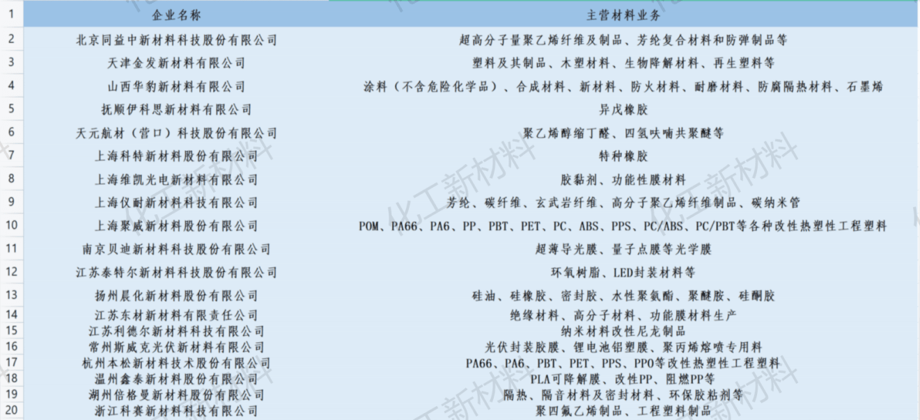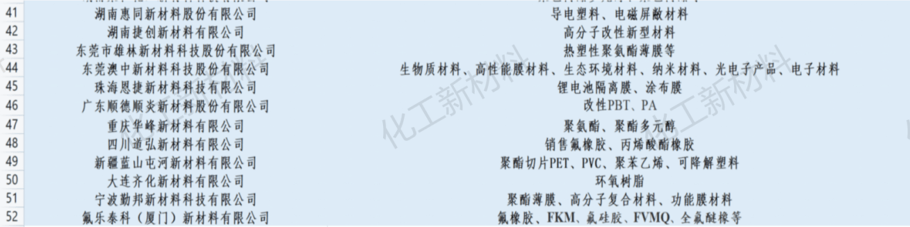 另外,揚(yáng)州晨化、天津金發(fā)、常州斯威克、合肥杰事杰、美瑞新材、湖南聚仁化工等逾50家化工新材料企業(yè)入選。