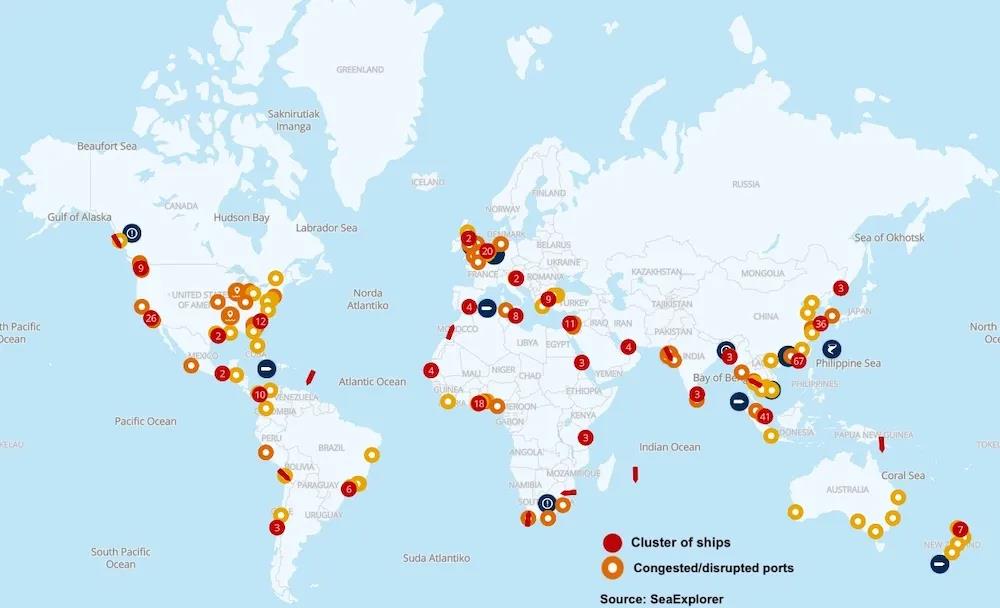 物流巨頭Kuehne+Nagel創建的集裝箱運輸平臺seapexplorer發布的一張地圖,突顯了當前全球各集裝箱港口超高壓的場景。