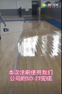 翻新工程選用的主材料是駿能化工3408B+6420復配的乳液,選用SO-27產品進行涂刷,可以達到更快的起硬速度,通用于透明和實色漆。視頻中進行翻新的運動場木地板呈現高光澤,高通透的效果。