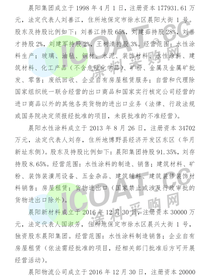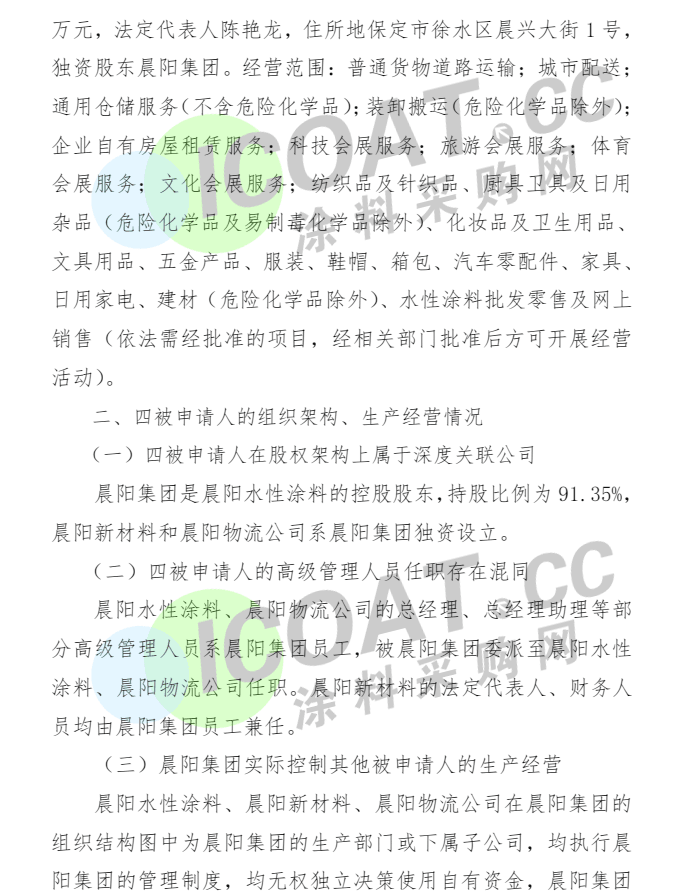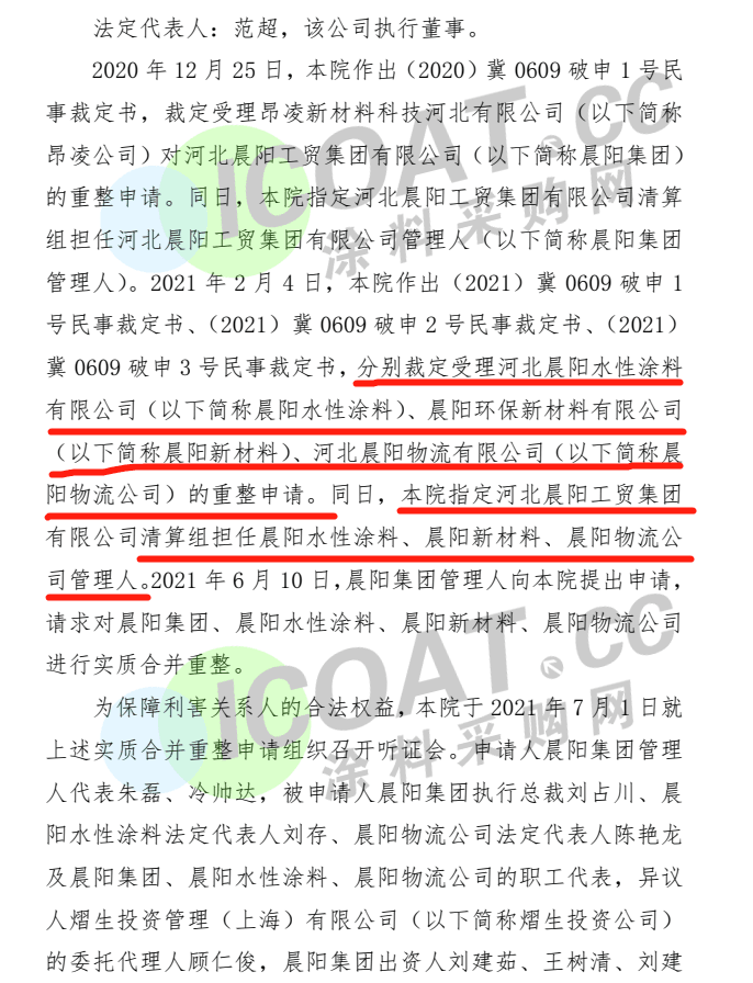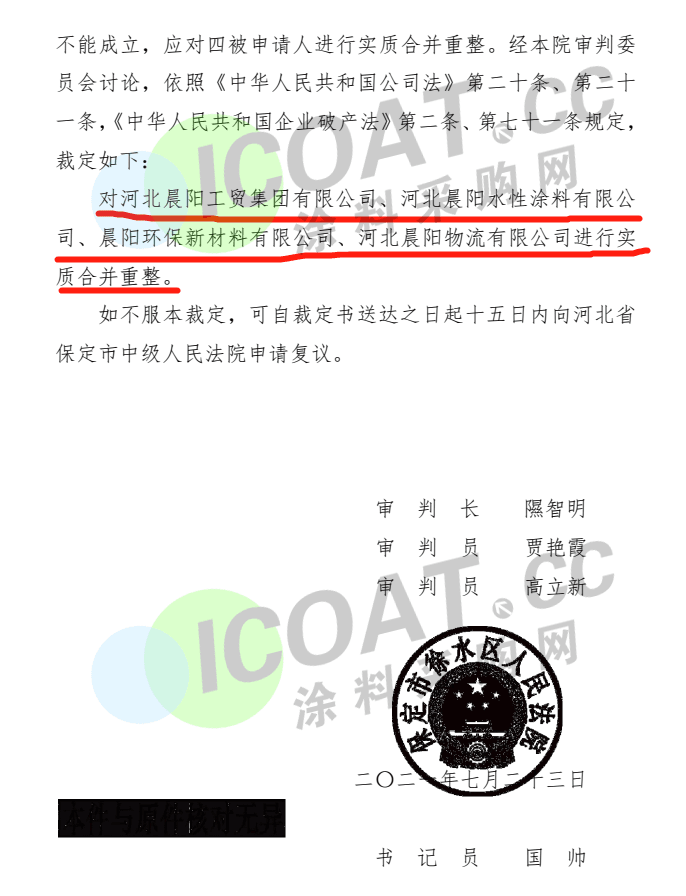 據(jù)裁定書(shū)顯示:2021年6月10日,晨陽(yáng)集團(tuán)管理人向徐水區(qū)人民法院提出申請(qǐng),請(qǐng)求對(duì)晨陽(yáng)集團(tuán)、晨陽(yáng)水漆、晨陽(yáng)新材料、晨陽(yáng)物流進(jìn)行實(shí)質(zhì)合并重整。