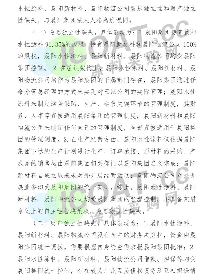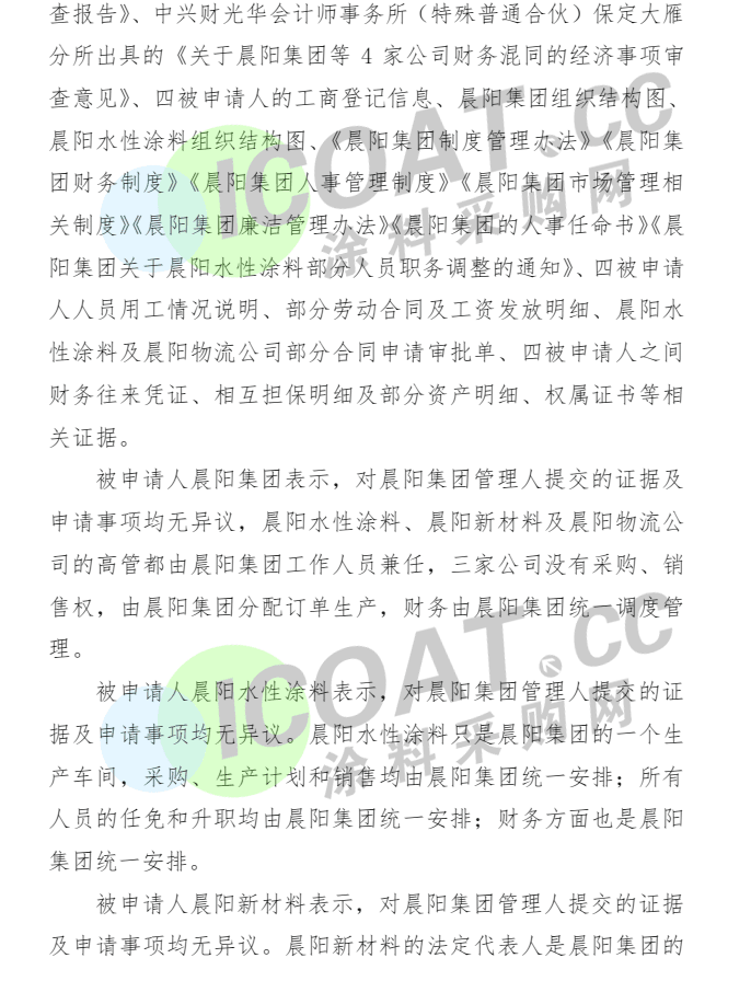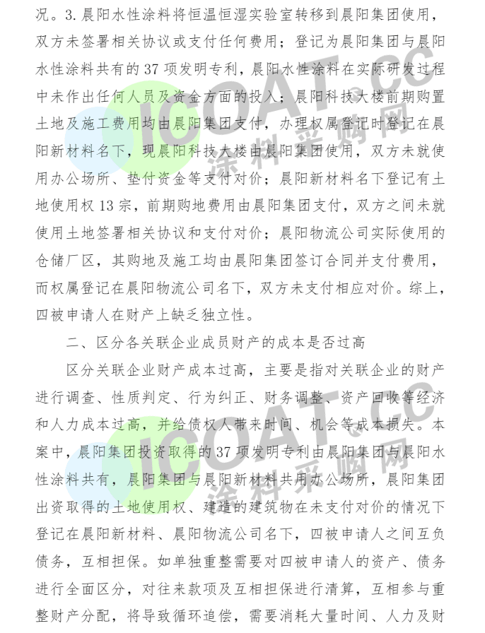 四、進(jìn)行實(shí)質(zhì)合并重整具有必要性。晨陽(yáng)水漆、晨陽(yáng)新材料、晨陽(yáng)物流已喪失法人獨(dú)立性特征,實(shí)際上淪為晨陽(yáng)集團(tuán)的具體業(yè)務(wù)部門(mén)。