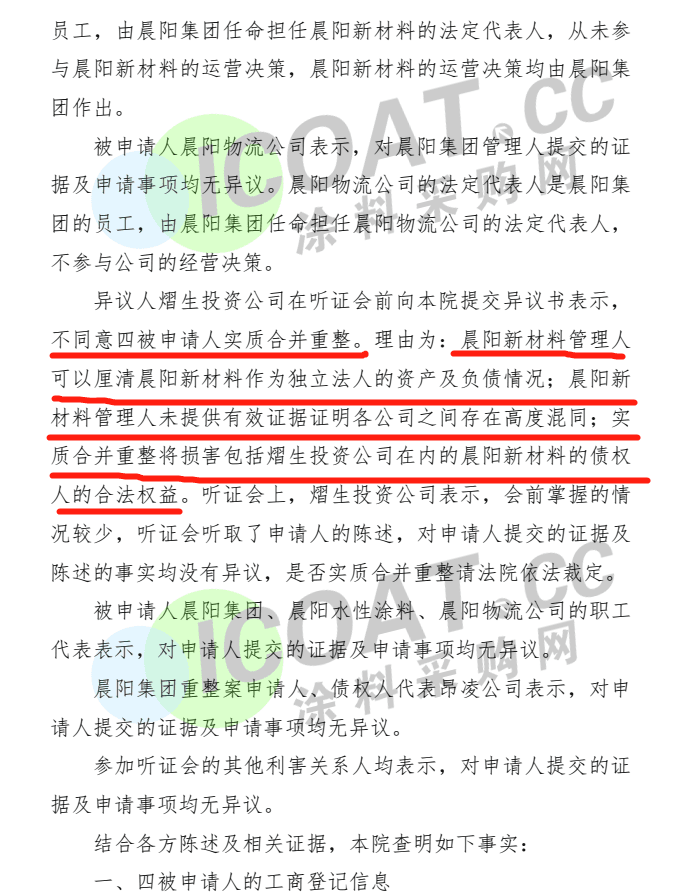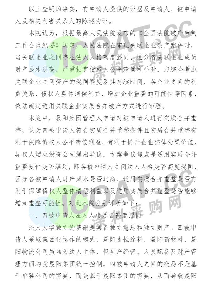 基于以上四點(diǎn)原因,河北省保定省徐水區(qū)人民法院裁定:對(duì)晨陽(yáng)集團(tuán)、晨陽(yáng)水漆、晨陽(yáng)新材料、晨陽(yáng)物流四家企業(yè)進(jìn)行實(shí)質(zhì)合并重組。