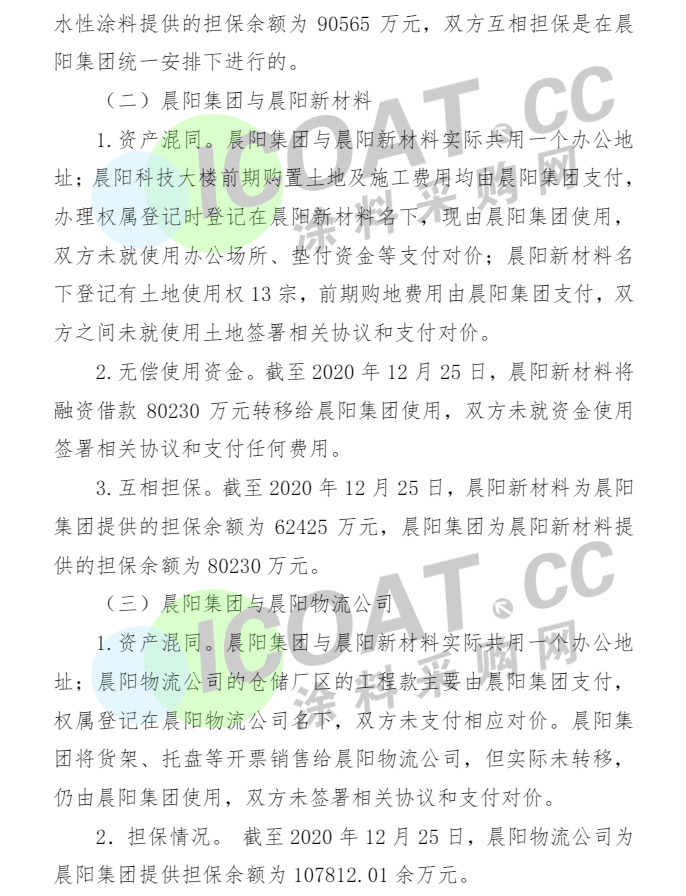 二、區(qū)分各公司財(cái)產(chǎn)難度大。晨陽(yáng)集團(tuán)、晨陽(yáng)水漆、晨陽(yáng)新材料、晨陽(yáng)物流四家企業(yè)之間的應(yīng)收類債權(quán)總額約為 20.60 億元,應(yīng)付類債務(wù)總額約為 35.68 億元,涉及相互擔(dān)保類債務(wù)總額約為 64.97 億元。