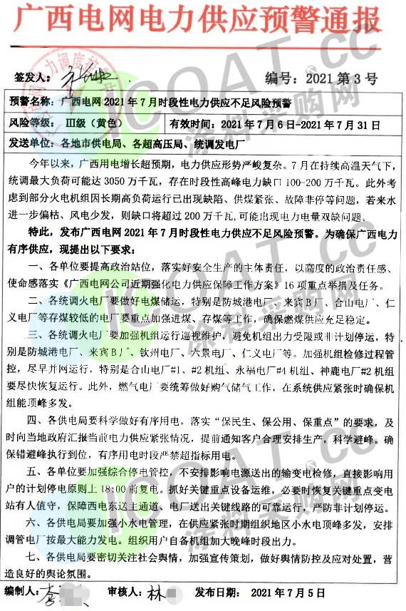 廣西電網(wǎng)發(fā)布電力供應(yīng)預(yù)警通報,要求個供電局做好有序用電,提前通知客戶合理安排生產(chǎn),科學(xué)避峰,確保錯峰避峰執(zhí)行到位,有序用電時段嚴(yán)禁超標(biāo)用電。
