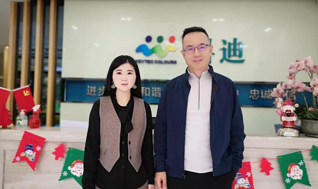廣東科迪色漿董事長陸明(右)與涂料采購網(wǎng)市場總監(jiān)王賽合影