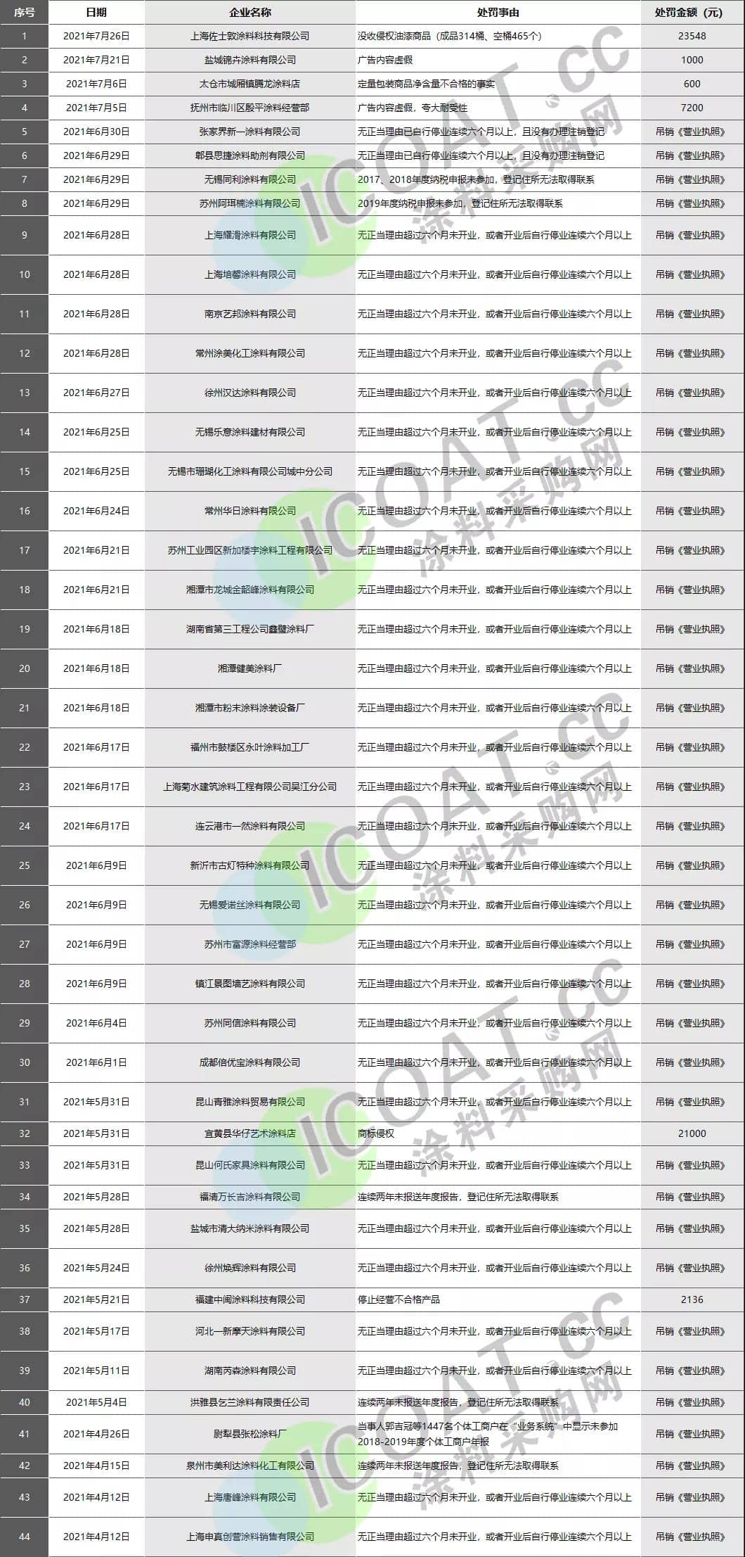 部分被處罰的涂料企業名單如下: