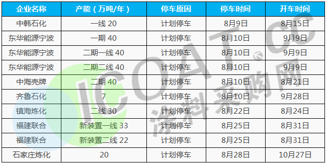 進入下半年以來,石油化工行業停車檢修計劃密集,陜西延長石油、石大勝華、中石化、齊魯石化、齊翔騰達等大廠陸續宣布停車檢修,涉及到的產能多達數百萬噸,周期最長可達2個月之久,讓本就貨源緊缺的行情雪上加霜。