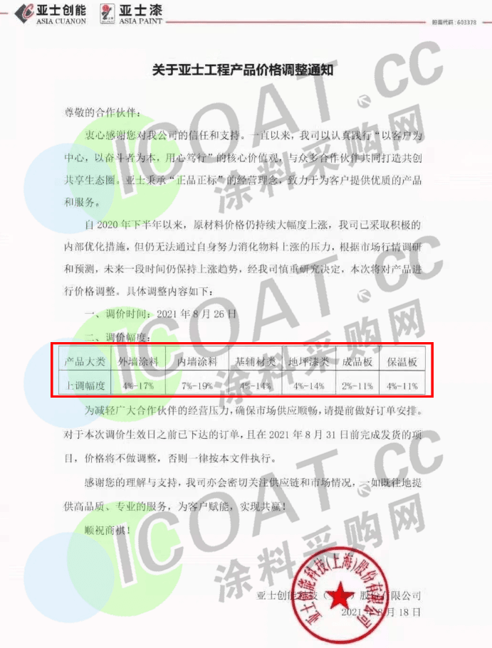 亞士創能:8月26日起,外墻涂料上調4%-17%,內墻涂料上調7%-19%,基輔材類上調4%-14%,地坪漆類上調4%-14%,成品板上調2%-11%,保溫板上調4%-11%。