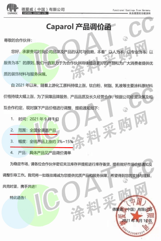 德愛威(中國)有限公司:9月1日起,全國全渠道全線產品上漲約3%-15%。
