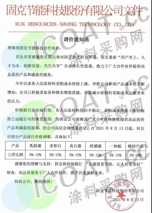 固克節能:8月13日起,乳膠漆上調5%-15%,多彩石上調5%-15%,真石漆上調5%-15%,質感漆上調5%-15%,一體板上調5%-15%,輔材產品上調5%-20%。