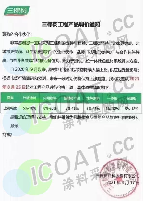 三棵樹涂料:25日起,外墻涂料上調5-18%,內墻涂料上調8%-20%,基輔材產品上調5%-15%,地坪涂料上調5%-15%,一體板上調3%-12%,保溫板上調5%-12%。