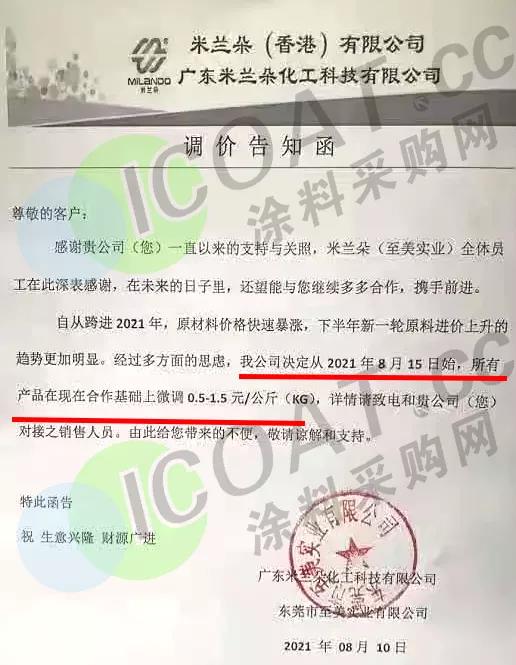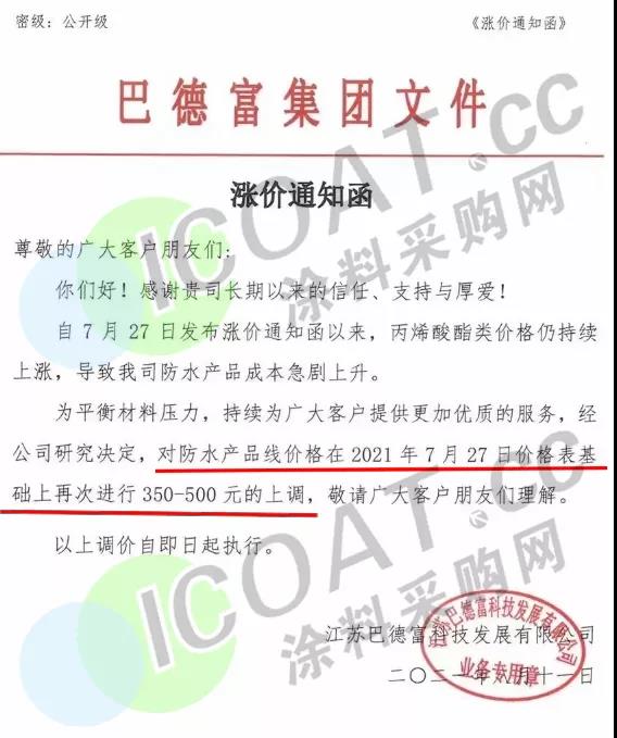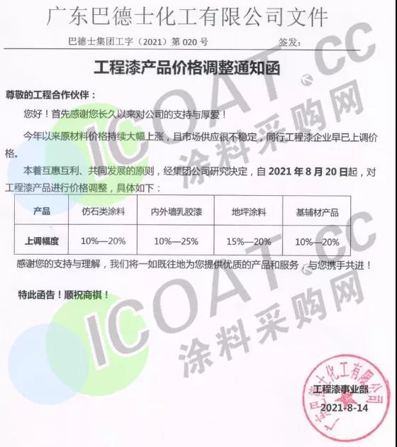 廣東巴德士化工:8月20日起,仿石類涂料上調10%-20%,內外墻乳膠漆上調10%-25%,地坪涂料上調15%-20%,基輔材產品上調10%-20%。