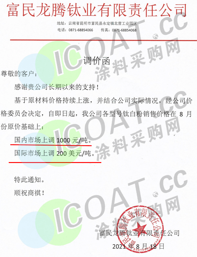 富民龍騰鈦業有限責任公司:即日起鈦白粉國內市場上調1000元/噸,國際市場上調200美元/噸。