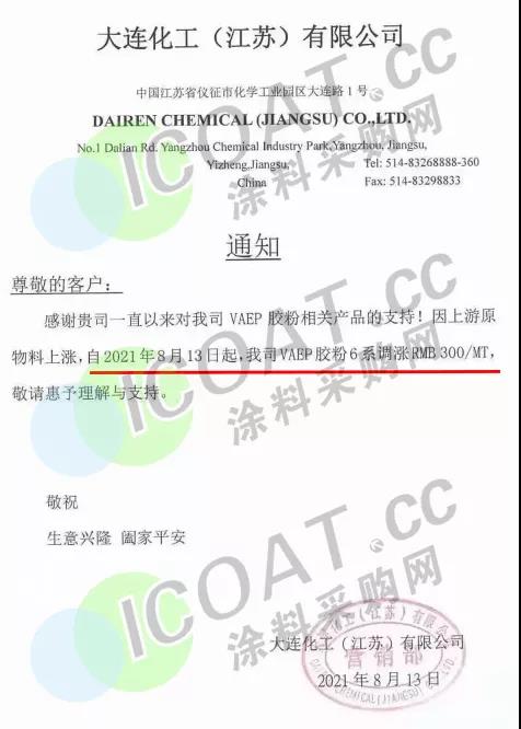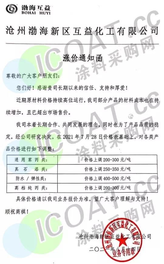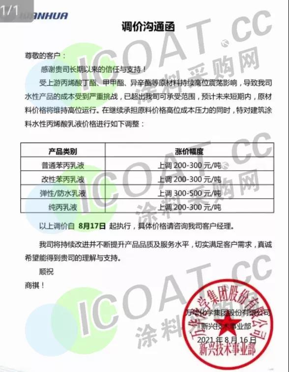 萬華化學新興技術事業部:8月17日起,普通苯丙乳液上調200-300元/噸,改性苯丙乳液上調200-300元/噸,彈性/防水乳液上調300-500元/噸,純丙乳液上調200-300元/噸。