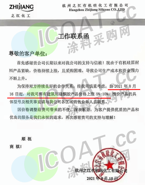 杭州之江有機硅化工:8月16日起,對所有建筑用硅酮膠產品上漲5%-10%。