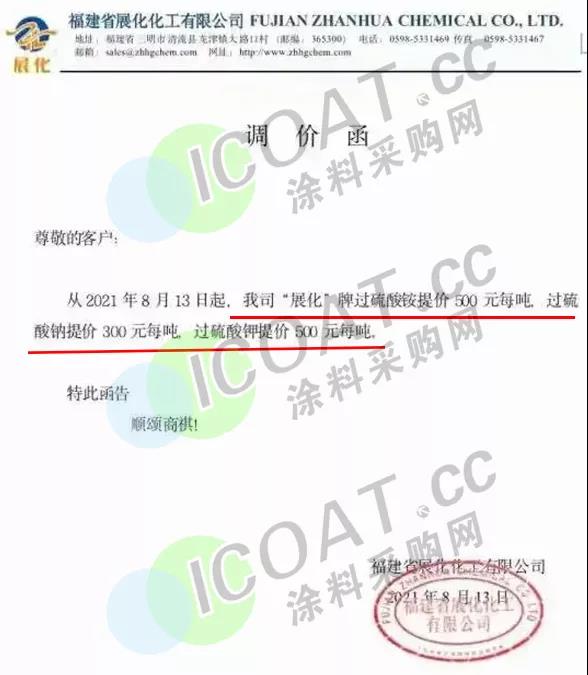 福建省展化化工:8月13日起,“展化”牌過硫酸銨提價500元/噸,過硫酸鈉提價300元/噸,過硫酸鉀提價500元/噸。