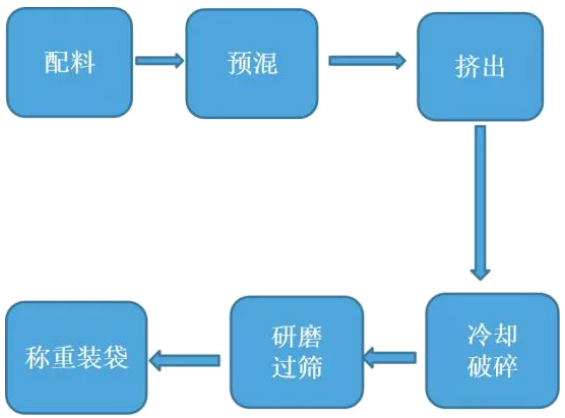 環(huán)氧粉末涂料的組成包括:環(huán)氧樹脂、固化劑、顏填料、流平劑等。環(huán)氧粉末涂料的制備過程如圖1所示。