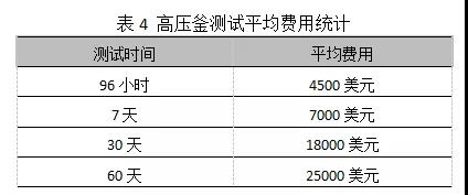 另外,延長高溫高壓的測試時間,能夠有效地評判涂層的性能。有研究者提出將高溫高壓測試時間延長至60天,理論上,高溫高壓測試的時間越長,所測結(jié)果的可靠性越強(qiáng)。但是該方法測試時間長,而且測試費(fèi)用很高。據(jù)Traylor[10]統(tǒng)計,測試費(fèi)用如表4所示。