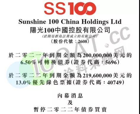 8月11日,陽光100發布公告稱,由于未能于到期日支付2021年債券的本金及溢價,因此已發生違約事件。違約事件將觸發陽光100發行的于2022年到期金額為2.196億美元的13.0%優先綠色票據的交叉違約條款。倘債權人選擇加速到期,該2022年債券可能即時到期及須予支付。同時,違約事件亦將觸發其他兩個票據的交叉違約條款,包括于2021年到期金額為1.70億美元的10.50%優先票據,以及于2023年到期金額為1.20億美元的12.0%優先票據。