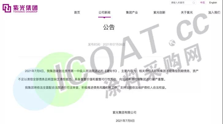 7月9日,債權人徽商銀行以紫光集團不能清償到期債務,資產不足以清償全部債務且明顯缺乏清償能力,具備重整價值和重整可行性為由,向北京一中院申請對紫光集團進行破產重整。