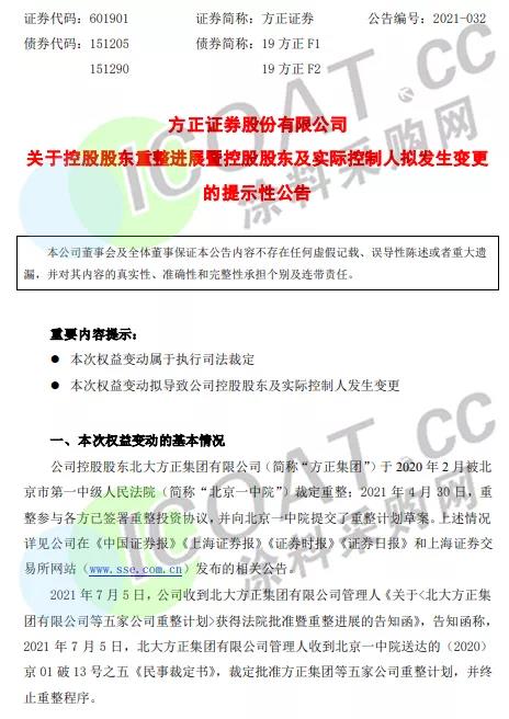 7月5日,北大方正集團有限公司發布公告稱,北大方正集團有限公司管理人收到北京一中院送達的《民事裁定書》,裁定批準北大方正集團有限公司等五家公司重整計劃,并終止重整程序。2019年末,北大方正集團有限公司一筆20億元的超短期融資券違約,債務危機引爆。2020年2月,北京一中院依法裁定受理北京銀行提出的對北大方正集團有限公司進行重整的申請,指定北大方正集團有限公司清算組擔任北大方正集團管理人。2020年7月,北京一中院裁定對方正集團、方正產控、北大醫療、北大信產、北大資源實質合并重整。