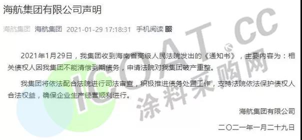 1月29日,海航集團發布聲明稱,收到海南省高級人民法院發出的《通知書》,主要內容為:相關債權人因海航集團不能清償到期債務,申請法院對我集團破產重整。重整前海航集團正在處理的投資人訴訟已經超過1000起,金額達到數億元。