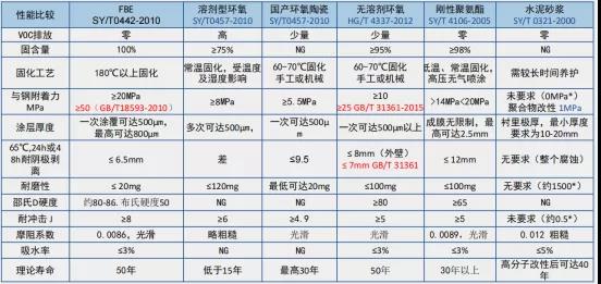 FBE、溶劑型環(huán)氧、國產環(huán)氧陶瓷、無溶劑環(huán)氧、剛性聚氨酯、水泥耗資等產品在VOC排放、固含量、固化工藝、與鋼附著力、涂層厚度等等方面的參數對比如下圖所示: