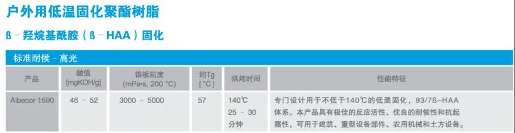 93/7 β-HAA超耐候低溫樹脂,160℃/15分鐘條件下可固化。不返霜,非常好的流平及柔韌性(比Albecor 6190更好的柔韌性)