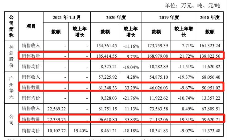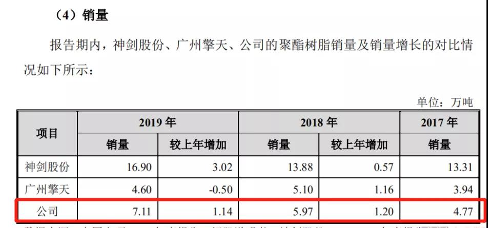 資料顯示,光華股份2018年、2019年、2020年的聚酯樹脂行業(yè)銷量分別為銷量63508噸、銷量71205噸和銷量97000噸。但其招股說明書卻列示為59620.71噸、71132.06噸和96618.80噸。